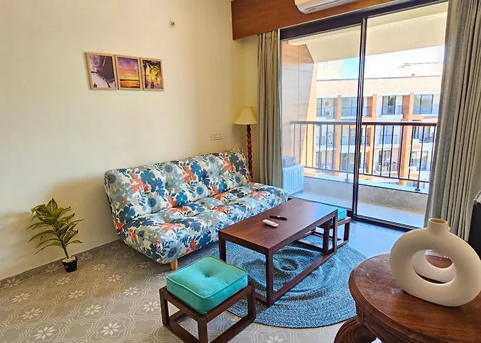 Elegant 1Bhk Couples Getaway With River View, Pool, Gym, Amenities - Near Candolim Beach apartment has a balcony and a sitting area, and comforts such as air conditioning. This 64 m² apartment offers guests the convenient feature of a hair dryer, shower caps, and bath sheets in the bathroom. A separate toilet, a shower, and a sink can also be found.